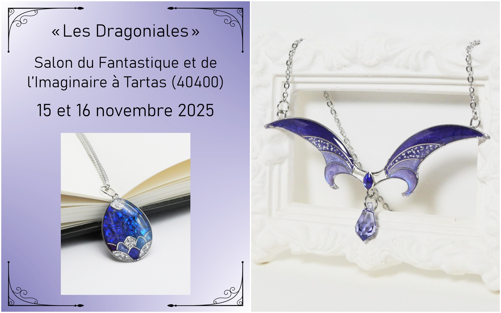 15/11/2025 et 16/11/2025: retrouvez-moi aux "Dragoniales", Salon du Fantastique et de l'Imaginaire des Landes, dans la Salle polyvalente de Tartas (28 Cr Saint-Jacques, 40400) pour deux belles journées au coeur des univers alternatifs, en compagnie de 39 autres exposants (artisans, illustrateurs et auteurs) ! Ouvert de 10h à 18h. Découvrez les divers concours organisés et la liste des exposants par ici