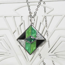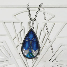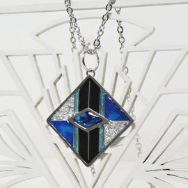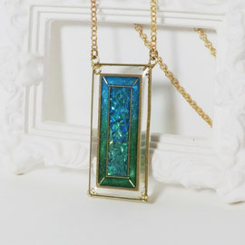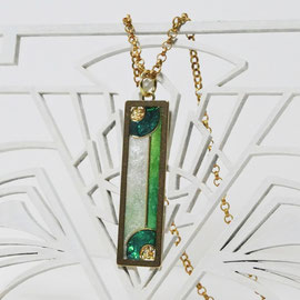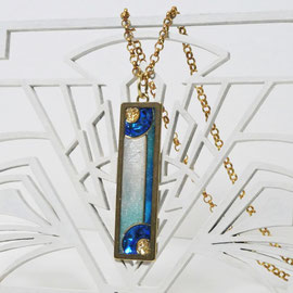 45 €, pendentif d'environ 3,5 cm de long sur 1 cm de large. Chaîne en laiton de 46 cm.